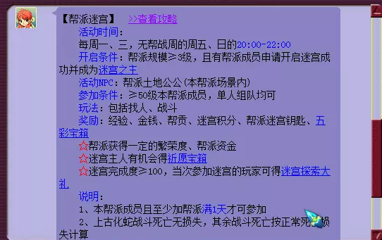 活动通常在周一、周三、周五以及没有帮战的周日晚上8点到10点开启。在活动时间内,小伙伴可以直接找帮派土地公公选择我要进入,就能传送到迷宫第一层清风密林。进入迷宫后,第一阶段需要击杀4个入侵者,每个入侵者提供25点信任度,凑满100点后就能找