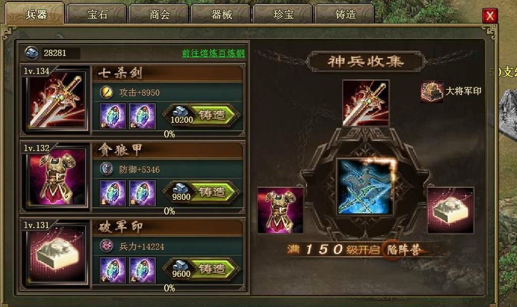 优先通过科技研究提升兵器等级上限,例如学习130级科技天铸神兵可将兵器最高等级提升至180级。兵器强化至满级后,可进行神兵合成,将两件兵器合成为进阶的三大神兵之一。兵书是重要的辅助资源,六韬兵书可升级为二十四篇,需根据自身路线选择对应的兵书