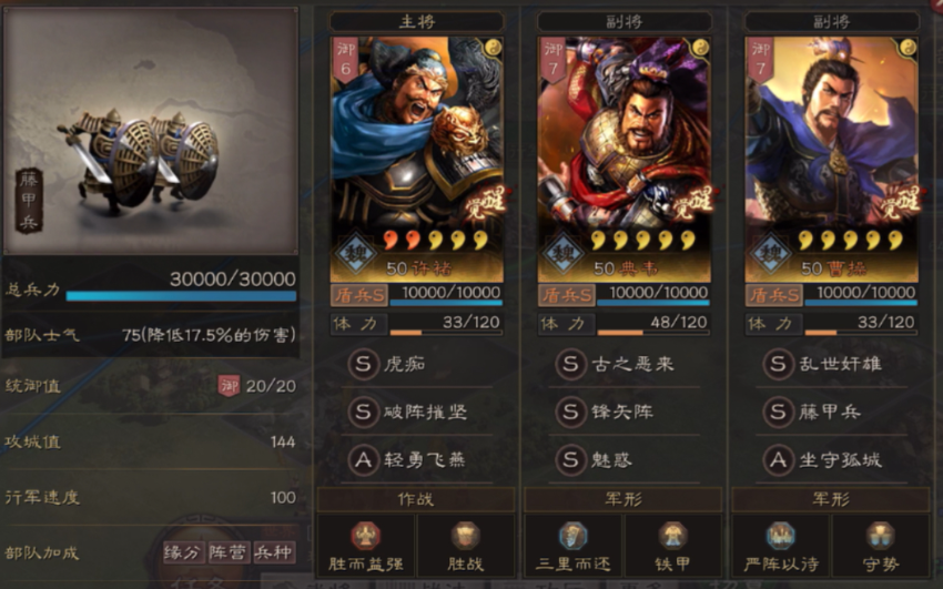 遇到由曹操、典韦、许褚组成的虎卫神威盾兵队确实有点头疼,这队伍靠着缘分效果和特殊机制,打骑兵和枪兵时特别硬,减伤明显。它的核心战法是虎卫军,每当主将快要挨普通攻击的时候,两位副将的武力会提升,还会联手反击打人一下,如果典韦或许褚自己带着这个