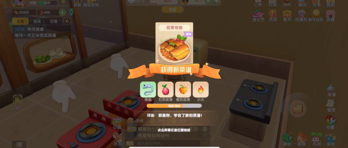 烹饪浆果带鱼时,火候选择中火能确保菜品成功率。餐厅售价为483摩尔豆,保温时长为2小时30分钟。每日可向NPC赠送自制料理以获取额外经验值,每次成功烹饪也能积累厨艺经验,有助于快速提升厨师等级。建议优先完成日常烹饪任务,逐步解锁更高阶菜谱。若夜间无法登录游戏,可提前储备带鱼;浆果类食材则建议每日例行采集,避免临时短缺。