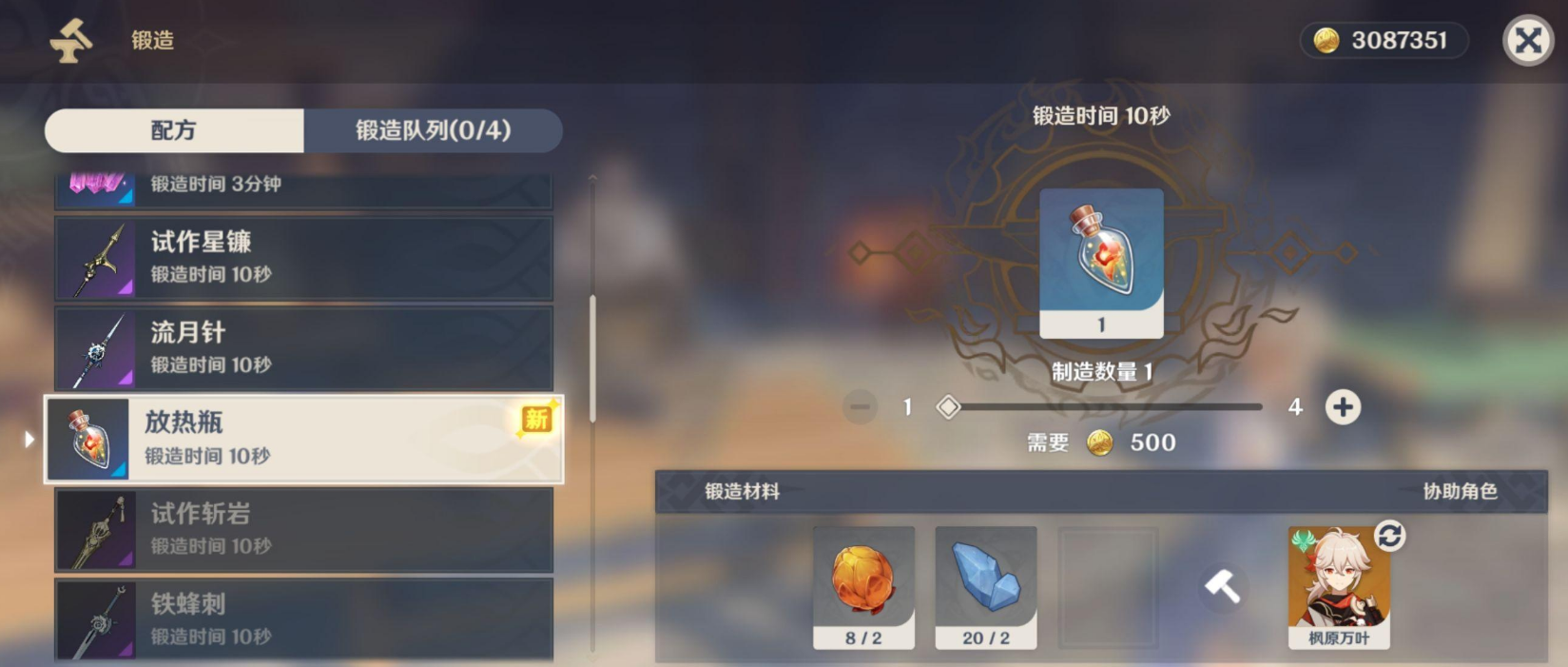 放热瓶是探索雪山时必备的小道具,它能帮你暂时驱散严寒值,避免在冰天雪地里持续掉血。想要制作它,得先把忍冬之树供奉到4级,这样就能拿到锻造图纸啦。材料方面需要2个烈焰花花蕊和2个星银矿石,前者平时采火元素花就能攒到,后者是雪山特产,找那种深蓝色带星星纹路的矿石敲碎就行。凑齐材料后直接去蒙德或璃月的铁匠铺,找瓦格纳或者老章对话选委托锻造就能制作了。