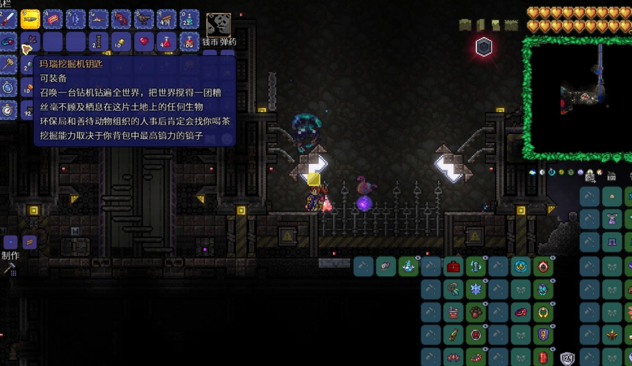 后期可以考虑制作钻头控制装置,这个坐骑类工具能进行大范围挖掘。需要准备陨石锭、狱石锭、叶绿锭等高级材料,在秘银砧旁制作。装备后按对应按键召唤,能快速清理大片区域。对于需要大量资源的建设任务,这个装置能节省大量时间。电脑版玩家还可以使用Ctrl键切换自动挖矿模式,长按鼠标就能连续挖掘。