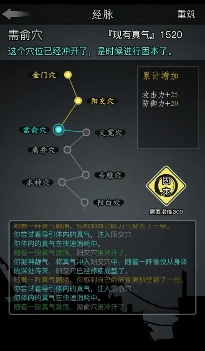 获得经脉天赋,首先需要了解经脉系统的基本玩法。经脉是角色内功修炼的核心,通过冲穴可以解锁不同穴位,每打通一条完整经脉就能随机获得一项天赋。冲穴需要消耗真气,真气可以通过调息或特定道具获取。冲穴过程中可能出现成功、堵塞、紊乱、暗疾四种情况,遇到暗疾时需要玩小游戏治疗,紊乱则需等待或找师傅帮忙。打通经脉后别忘了用潜能进行固本强化属性,优先提升气血和内力上限对战斗帮助最大。