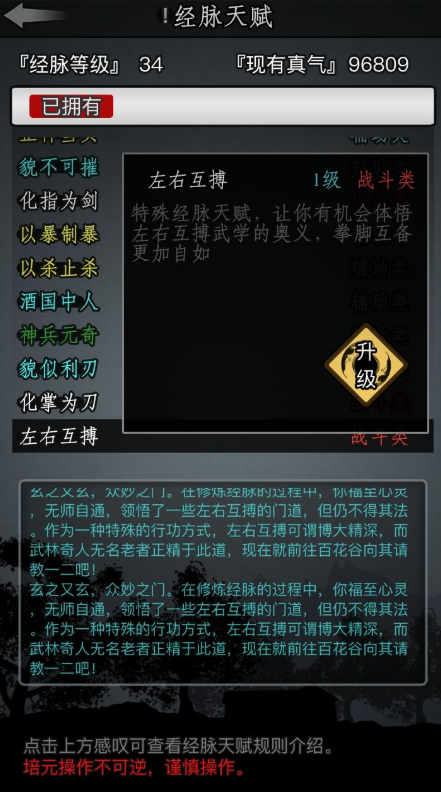 后期重点是利用丹药和特殊玩法优化天赋组合。炼制高阶丹药如忘三生可解锁毒术类天赋,参与酆都城捉鬼、奈何桥任务能获取提升天赋等级的稀有道具。左右互搏是特殊天赋,需通八脉后通过无名老者的测试才能激活,对拳脚武学互备有质变效果。