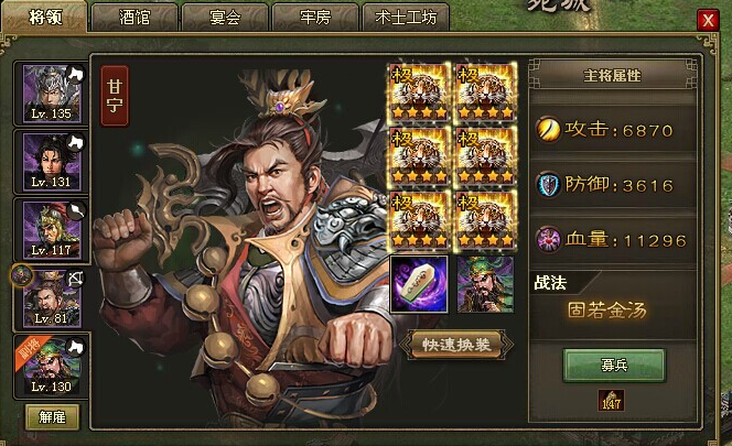建议先用吕蒙或徐晃这种炮灰将去消耗敌方第一个部将,接着夏侯惇上场,第一排兵打死残血部将后硬吃第二个部将的战法。夏侯惇的最后一排记得放战法,这样能扛住第三个部将的攻势。甘宁一上场就直接甩战法,争取快速清掉小兵,让他的第三排能对上许褚。这里很看运气,如果甘宁能格挡许褚的战法,基本就稳了,马超最后收割残局就行。