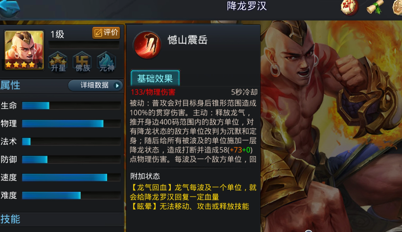 降龙作为佛族四星角色,在战斗中属于先手输出型英雄,拥有真佛性属性,对魔族角色能造成额外伤害。每隔12秒自动清除所有负面状态,飞升后普攻第三击有概率眩晕敌人1秒。天赋系统共有六个选项,包括御风迅雷、乘胜追击、震岳惊天、神龙护体等,觉醒后先手能力和输出强度大幅提升,是团队中强力的战将型角色。