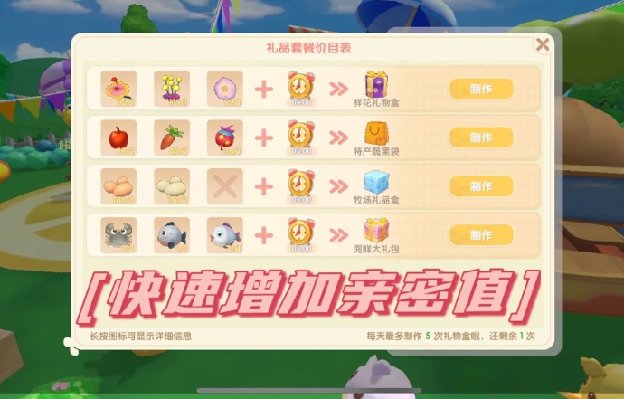 最后制作鲜花礼物盒需要5分钟时间,做好后记得及时收取。平时可以多囤点材料,比如萤火草、樱花树和牡丹花,这样需要送礼时就能随时制作。如果暂时缺某种花,也可以看看好友家有没有特产,或者去商店碰碰运气。要掌握好制作和赠送的技巧,很快就能和庄园里的NPC们成为好朋友。