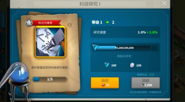 捐献机会主要通过参与联盟科技研究获取。玩家进入联盟界面后点击科技栏,可选择发展、领土、战争和联盟技能四大类项目进行捐献。每次捐献需消耗木材、石料等资源或宝石,系统每隔一段时间刷新免费捐献次数,每日和每周联盟会根据捐献排名发放额外奖励。优先捐献官员推荐的科技项目能更高效提升联盟整体实力,同时为个人积累贡献值。