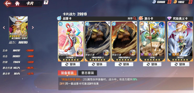 不同角色适合的战意卡效果差异较大。输出型角色,比如鹰眼、艾斯,推荐选择提升攻击力或暴击率的套装,比如到海盗的巅峰来能增加技系18%攻击力,自然系还能额外提升暴击率。肉盾或辅助角色,比如撒谎布,可以选择增加生命值或防御的套装,增强生存能力。多段攻击角色,比如路飞,暴击收益更高,而单段高伤角色则更适合堆攻击力。融合进化时,尽量选择同类型战意卡,有机会生成更强力的新卡。
