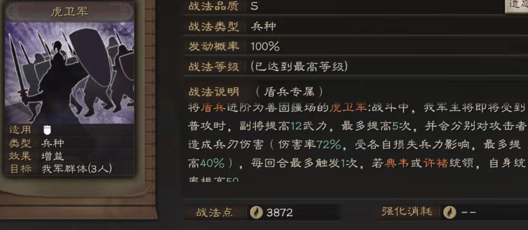 虎卫军的战法特性是关键,主将受到普攻时副将会提高武力并对攻击者造成兵刃伤害。典韦和许褚统领虎卫军时还能额外提升自身统率,这让队伍的坦度更上一层楼。注意虎卫军的触发条件是主将即将受到普攻,所以嘲讽类战法比如守而必固可以稳定触发效果,但援护类战法无效。典韦自带战法古之恶来能帮主将挡刀,配合气凌三军或后发制人能打出多段反击。