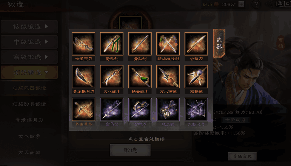 丈八蛇矛是张飞的专属武器,其特技雄烈能让张飞在战斗前两回合获得破阵状态,无视目标的统率和智力,大幅提升输出能力。这个特技在游戏中排名前三,是许多玩家梦寐以求的装备。获取丈八蛇矛主要有三种途径:锻造、寻访和兑换,其中锻造是最主要的获取方式,需要收集特定材料并有一定运气成分。