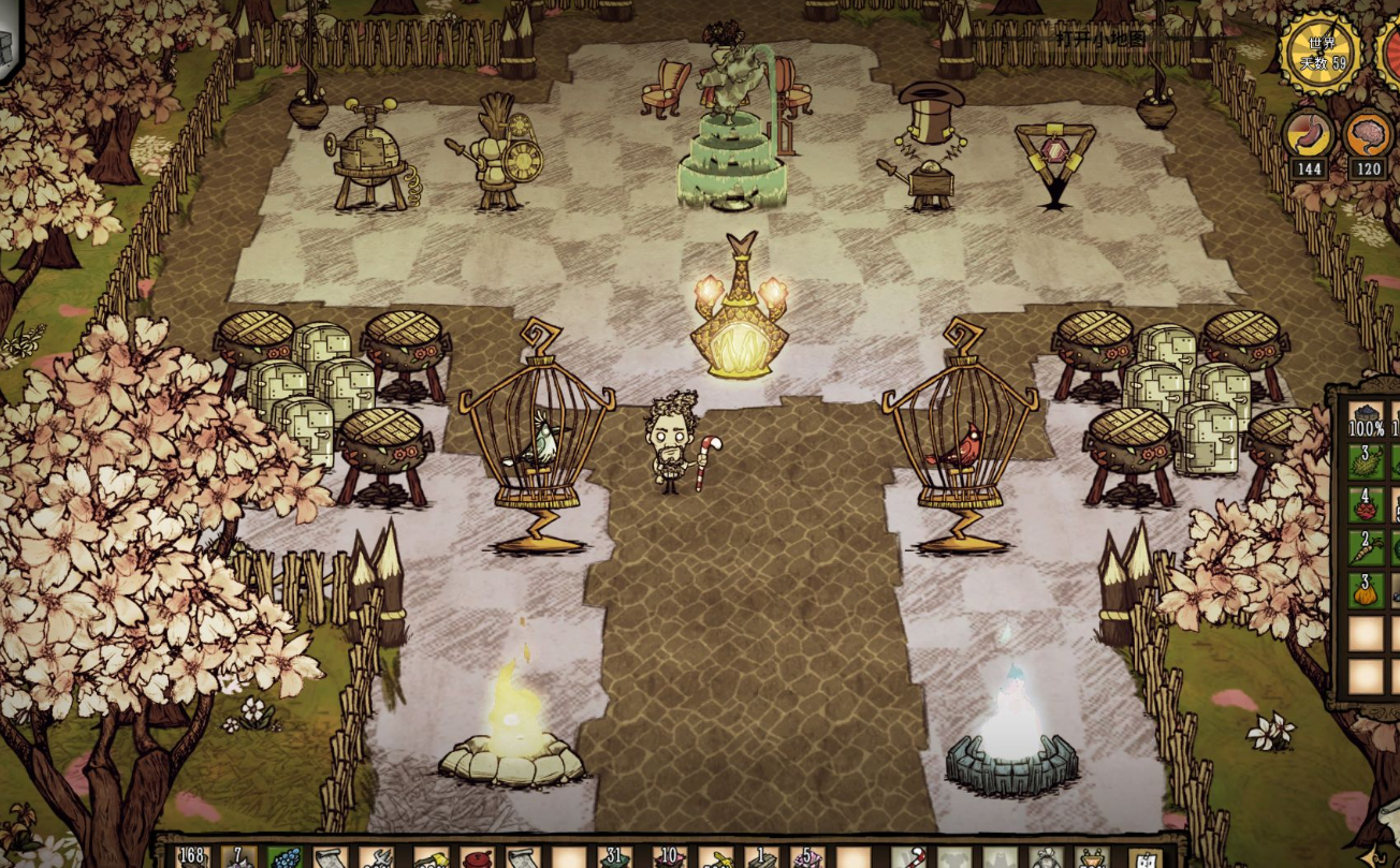 基地选址需靠近沙滩和森林,便于获取燧石、树枝和竹子等基础资源。木地板能防止雨季积水,沙袋可填平水坑,但需覆盖全部视野范围。科学机器和炼金引擎应尽早建造以解锁高级工具。防雨设施如雨伞、猪皮帽或双层伞必不可少,潮湿会大幅降低理智。飓风季需加固建筑,避免散落物被吹走,同时远离涨潮区域防止设备进水失效。