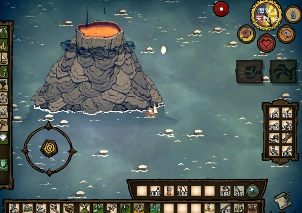 航海探索是获取金矿和高级资源的核心途径。初期用木筏或货船,后期推荐齿轮船提升效率。旗鱼剑是海上战斗的最优武器,攻击力高达68,耐久150次,适合应对鲨鱼和猎狗。遇到鲨鱼群应优先回岸战斗,避免在海上被围攻。火山是重要地标,靠近时视角会自动拉高提示位置,其周边荧光水母群可作为定位参考。