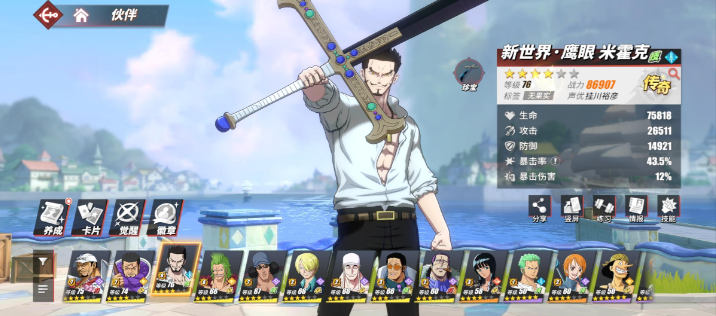 如果你更注重竞技场表现,可以优先培养鹰眼和黑足山治。鹰眼的剑术攻击范围广,连招流畅,适合喜欢操作的玩家。黑足山治则凭借灵活的位移和爆发伤害,在PVP中占据一席之地。需竞技场角色需要较高的熟练度,建议先练习基础连招再投入资源培养。