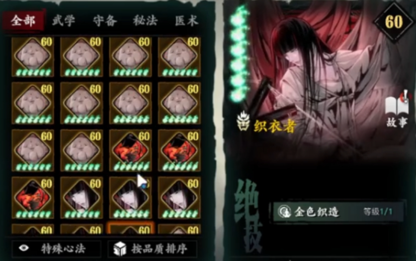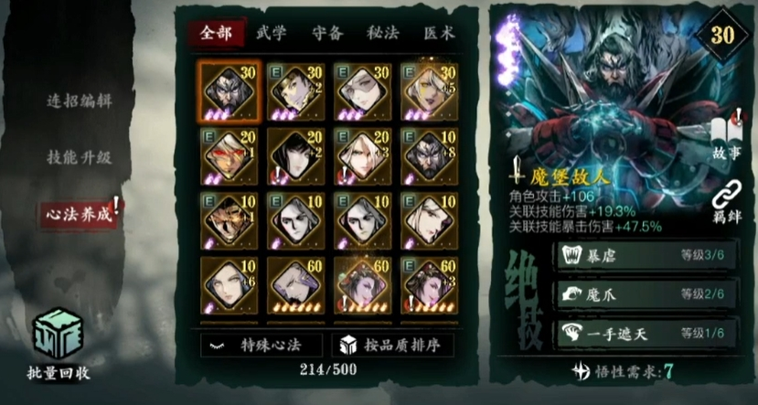 织衣者作为稀有道具,获取数量有限,建议优先用在核心心法上。比如魔堡故人这类高价值心法,绝技等级提升后能显著增强战斗力。如果直接把织衣者喂给空白心法,可能会浪费资源。需心法升火后绝技等级上限会自然提升,但魔堡这类心法升火难度较高,所以提前用织衣者拉高绝技等级是划算的选择。