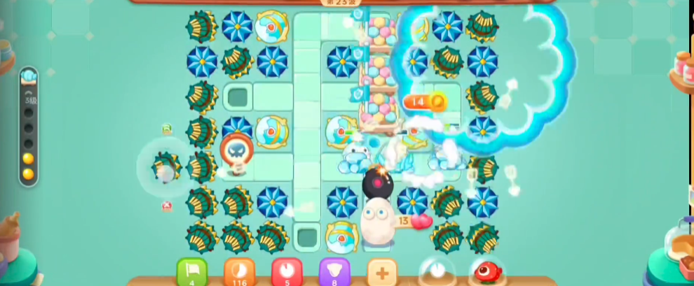 第二个飞碟会在第二十波登场,不仅会吸炮塔,还会冰冻周围单位,所以炮塔别扎堆放。这时候多建雪球或冰冻星减速,搭配鱼刺控场,让怪物走得更慢。如果飞碟扔炸弹,立刻卖掉被标记的炮塔减少损失。道具别省着,核弹和地雷关键时刻能救场,尤其是第三只飞碟出现时,它的血厚技能多,复活后的加速buff能帮你快速解决它。