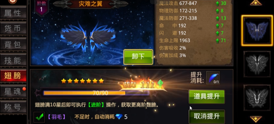 翅膀升级采用先升星后进阶的双重机制。初始1阶翅膀需通过羽毛升至10星才能触发进阶,羽毛可通过每日活跃任务、魔晶兑换、商城购买等渠道获得。进阶时每次使用神鹰火种都会增加祝福值,当祝福值蓄满必定进阶成功。这种设计使得低阶翅膀的养成相对平滑,但5阶以上每次进阶所需的火种数量会显著增加,需要玩家合理规划资源分配。