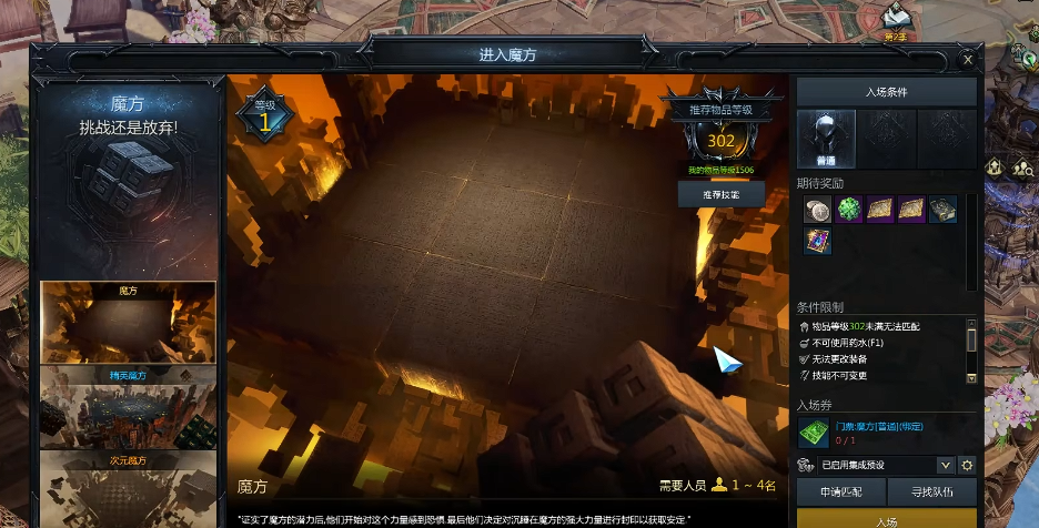 魔方副本的三种颜色(蓝、红、黄)对应不同难度和入场条件。蓝色魔方需要角色等级达到500红色魔方要求700级黄色魔方则只需250级。无论选择哪种颜色,均需消耗3张希里安的指令作为入场材料。入场后,副本机制类似高塔挑战,玩家需逐层突破,每层任务目标可能包括击败特定敌人、生存一定时间或完成解谜等。
