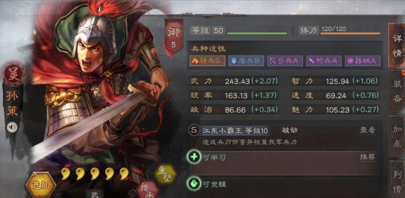 孙策作为首充即可获得的五星武将,其自带战法江东小霸王能在普通攻击后概率触发额外伤害并恢复兵力,这决定了战法搭配需围绕强化连击和输出展开。A级战法因其获取相对容易且效果直接,成为新手和资源有限玩家的首选,核心思路是通过连击类战法提高普通攻击频率,从而最大化自带战法的触发几率,为队伍提供稳定输出与续航。
