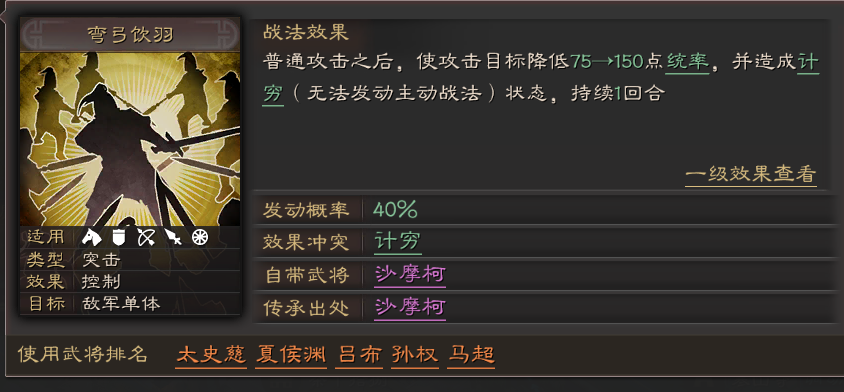 强攻是孙策最推荐的A级战法,它能提供连击状态,使孙策每回合有机会进行两次普通攻击,显著增加江东小霸王的触发概率,兼顾伤害与兵力恢复。手起刀落作为突击战法,在普通攻击后追加兵刃伤害,简单高效地提升单点爆发;弯弓饮羽则兼具输出与控制,普攻后降低敌方统率并施加计穷状态,有效削弱对手防御与技能释放。这些战法与孙策的武力属性高度契合,能快速在前期开荒或中期对战中建立优势。