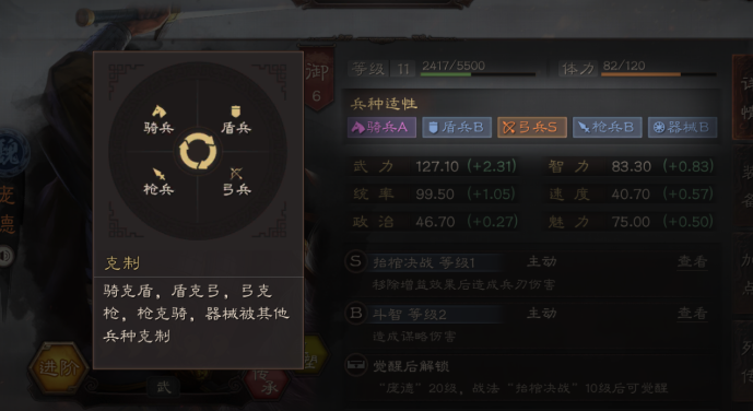 知道了兵种谁克谁还远远不够,接下来你得看看你手里的武将擅长带什么兵。每个武将都有兵种适性,从高到低分为S、A、B、C几个等级。一个武将领着S适性的兵种出战,能发挥出120%的威力,要是让他带着只有C适性的兵种,那实力可就大打折扣了。所以在组建队伍的时候,尽量让三个武将都挑他们最拿手的兵种,比如三个人弓兵都是S,那组一队纯弓兵队,光基础属性就很吓人了。实战中没那么完美,有时候为了凑成一个强力的队伍组合,可能某个武将只能用A适性的兵种,这也是可以的,但核心输出武将最好还是用S适性的,这样才能打出足够的伤害。