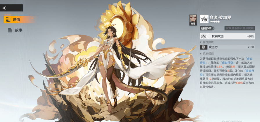 她的核心玩法围绕关键的缚火状态展开。在缚火状态下,阿修罗能获得火属性伤害加成,而核心输出技能虚炎行空的形态与伤害与缚火状态息息相关。专属钥从命者·娑伽罗能极大改变她的输出模式,获得或延迟缚火状态时会强化虚炎行空,使其变为持续造成伤害的火焰地涌,并持续降低敌人的火属性抗性,同时提供能量回复。在神格选择上,有不同的路线以适应不同需求,例如追求稳定输出和续航的泛用路线,或是侧重爆发伤害的路线,玩家可以根据自己的操作习惯和配队进行选择。