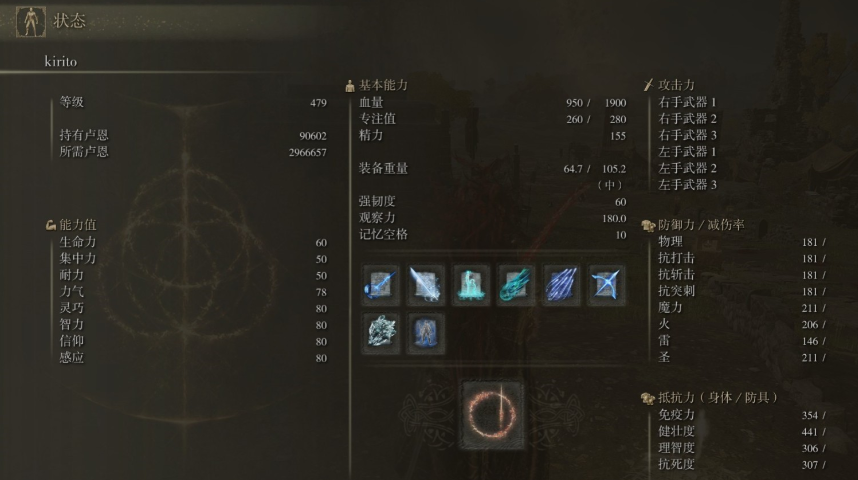 毕业属性的分配必须与你计划使用的终极装备和法术体系紧密联动。你的武器和法杖选择直接决定了力量、灵巧、智力或信仰的硬性门槛,例如名刀月隐对灵巧和智力有要求,而死王子杖则同时需要高智力和高信仰。护符的选择也会影响属性规划,例如追求极致输出时可能佩戴魔力对蝎,但这会降低减伤率,从而可能要求你投入更多属性到生命力以作补偿。你所依赖的核心法术决定了集中力的需求,频繁使用帚星、彗星亚兹勒等高耗蓝法术,必然需要更高的集中力来支持。