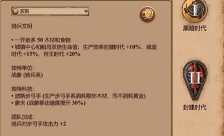 波斯是一个在后期陆战中压制力极强的文明。它的核心优势在于拥有高生命值的战象单位,配合特有科技沸城还能对攻城武器造成额外伤害。波斯开局就拥有额外的黄金,村民的资源采集效率也有显著提升,这使得它在经济上优势明显,能为后期昂贵的战象军团提供充足的资源支撑。