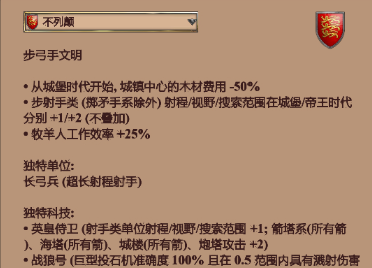 不列颠的强势点在于其独一无二的远程射程。它的长弓兵在帝王时代拥有全游戏最远的射程,这使得它非常适合进行远程消耗和防御作战。长弓兵的生命值较低,非常依赖前排近战单位的保护,在进攻时需要精心搭配兵种组合来扬长避短。