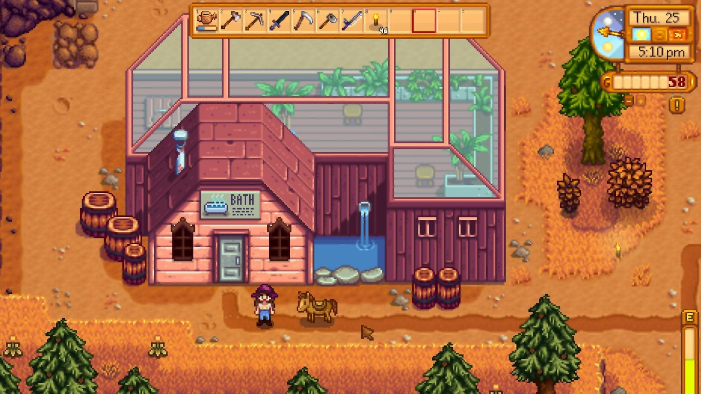 解锁后就可以自由进出温泉山洞了,这里是个恢复体力的好地方。只要泡在温泉里不动,体力就会慢慢恢复,特别适合在挖矿或劳作后过来放松。温泉位于铁路区域,从农场往北走就能找到,山洞内部有男女分开的更衣室,记得要进对应性别的更衣室哦。泡温泉时角色会自动脱掉衣服,这个设计还挺有趣的。