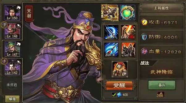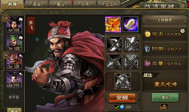 觉醒后,张飞的战法从震天咆哮进化为灭世咆哮,技能效果大幅提升,包括对敌方三排部队的伤害以及击退效果。被动技能龙吼进一步强化生存与输出能力。觉醒技能触发概率为100%,且敌方血量越低伤害越高,使其在副本和国战中表现突出。