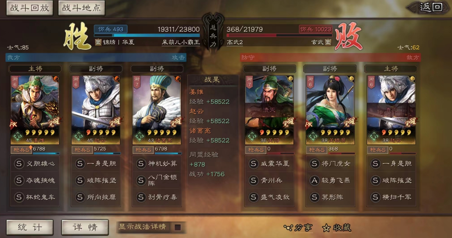 天水枪的优势在于稳定的指挥和被动输出,阵营加成和天水之战缘分提升的16点武力进一步强化了赵云和姜维的战斗力。阵容对夺魂挟魄等核心战法的依赖度较低,适合战法资源有限的玩家。白毦兵的谋略伤害补充了输出短板,八门金锁阵的减伤效果提升了生存能力。诸葛亮的治疗和姜维的属性削弱形成良性循环,使队伍在持久战中逐渐占据优势。