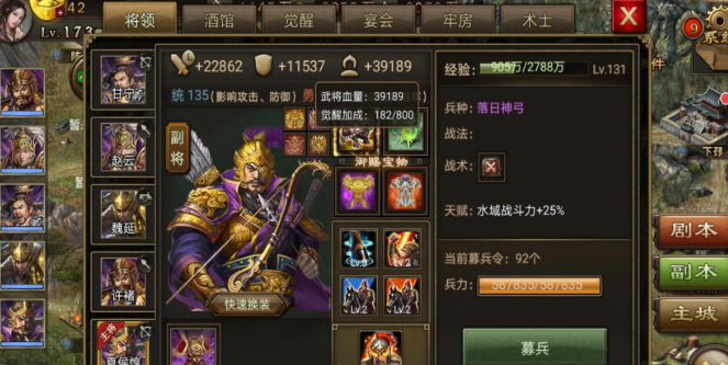 曹仁的普攻和大招都是物理伤害,所以护甲和格挡属性的装备优先级最高。技能石方面,暴击和强袭能提升输出效率,而坚守和乱舞可以增强生存能力。如果咱们有红甲或者紫甲,优先给前排穿上,后排则堆攻击和暴击。战车如果能用上就更好了,多一截兵力容错率会高很多。