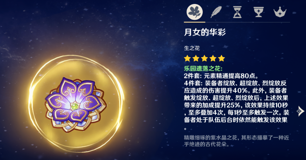刷取建议方面,这套圣遗物的泛用性还不错,两件套的精通加成对很多角色都有用。如果打算长期玩绽放体系,那确实值得投入资源去刷一套。不过它的四件套效果只对草原核伤害有加成,所以如果不是专门玩绽放队的话,可能暂时不需要优先考虑。记得多留意主词条的选择,生命杯或精通沙都是不错的选项。