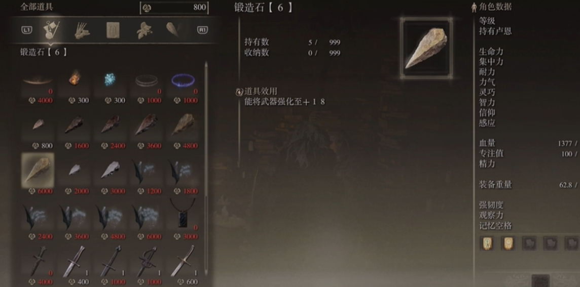 六级锻造石是艾尔登法环中用于将武器从+15强化至+20的关键材料,属于游戏中后期较为稀有的资源。最稳定的获取方式是通过圆桌厅堂的孪生老妪处无限购买,但需要先提交锻造石矿工的铃珠3解锁购买权限。该铃珠位于巨人山顶区域的萨米尔废墟,具体位置在赐福点附近的地窖内,开启宝箱即可获得。提交铃珠后,六级锻造石的售价为4800卢恩,适合需要批量强化的玩家。需孪生老妪处同时会解锁五级锻造石的购买权限,不要混淆两种材料。