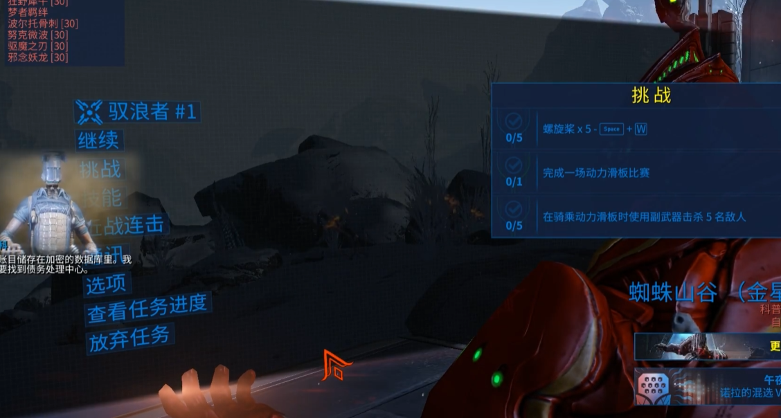 完成星际战甲驭浪者任务第一页需要掌握滑板操作技巧和任务触发条件。首先确保已完成前置任务索拉里斯之声,否则无法解锁该系列任务。建议自制K式悬浮板而非使用系统赠送的滑板,自制滑板操控更灵活,能有效降低任务难度。任务核心在于组合键操作与特技得分积累,例如长按蓄力键可实现更高跳跃,配合鼠标左右键与空格键完成空中翻转动作。