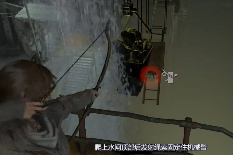 回到长平台后,用弓箭发射绳索连接刚才放出的小矿车和绳柱。这一步要注意瞄准时机,确保绳索牢固固定。接下来爬上水闸顶部,同样用弓箭固定住机械臂,这样就能为后续操作做好准备。固定完成后返回中间吊着的矿车处,跳上去利用重力让矿车滑下去。矿车下滑时会触发连锁反应,最终撞开水闸完成解谜。整个过程需要保持耐心,如果第一次没成功可以多试几次调整角度。