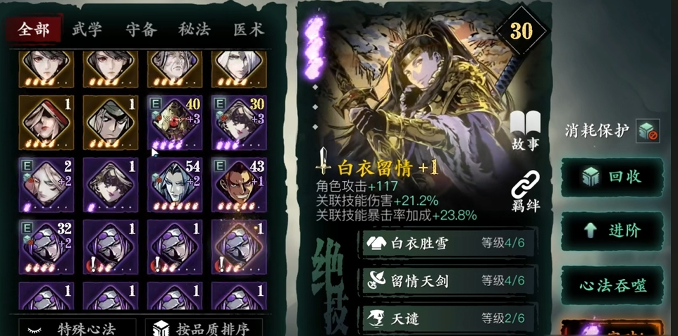 白衣留情是游戏中非常强力的橙色品质心法,主要效果围绕防御加成和召唤剑技展开。它的核心技能留情天剑能在释放关联技能时召唤留情剑,对前方敌人造成200%攻击力的伤害,这个效果随着绝技等级提升还能进一步增强。白衣胜雪提供10%防御加成,而天谴留情剑则有概率让敌人眩晕2秒,这三个技能组合让白衣留情成为攻防一体的心法选择。