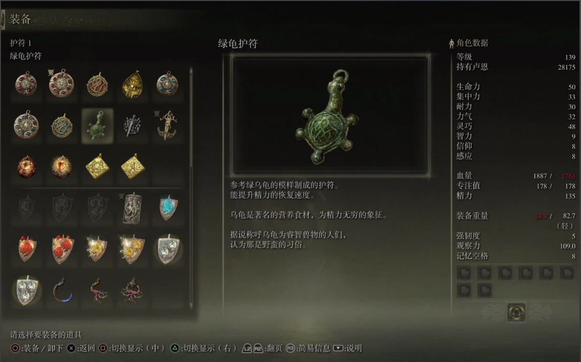 虽然重甲防御高,但超过负重阈值会影响移动和翻滚。建议把负重控制在中等水平,保留一定机动性。护符选择也很关键,众武护符能增加负重上限,绿龟护符提升精力恢复,这些都能弥补重甲的缺点。记住没有绝对完美的套装,关键要找到适合自己的搭配。