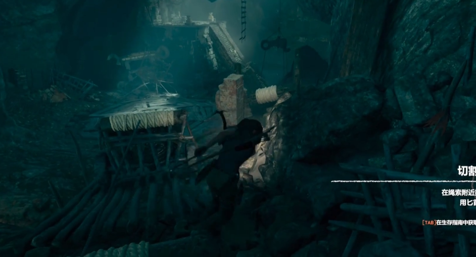 接下来要处理右前方坡上的推车,把它推到转盘附近。按互动键转动转盘,让推车带绳索的一端对准自己。用绳索箭矢把推车和转盘连起来,再转一次转盘把推车拉上斜坡。这时候别急着走,记得切断绳索让推车冲下去撞飞障碍物。这个操作会让另一侧的吊钟抬高,咱们就能利用它爬上更高平台。