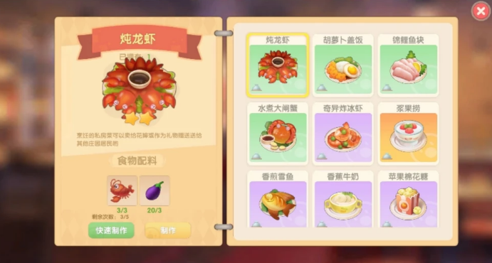 有了小龙虾之后,咱们可以尝试制作其他美食,比如炖龙虾。这道菜需要小龙虾作为主料,搭配茄子和南瓜。茄子可以在家园种植,南瓜则通过日常任务或商店购买获得。烹饪时注意火候控制,不同的菜品对火候要求不同。餐厅里出售这些菜品能赚取不少摩尔豆,所以记得经常研究新菜谱哦。