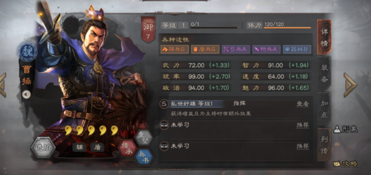 给曹操搭配兵种可是个技术活儿,因为他本身可是个多面手,能抗能辅。游戏里曹操的盾兵和骑兵适应性都是顶级的S级,这就为主公们提供了两个非常核心的组建方向。你想让他带队硬扛打防守,那就走盾兵路线;想让他带着兄弟们冲锋陷阵打快攻,那就走骑兵路线。这两种玩法都能把他那超高的统率属性给用上,让他变得非常耐揍,普通的物理攻击打在他身上就跟挠痒痒似的。选兵种的第一步,就是看你想让曹操在队伍里主要干啥,是当一面稳如泰山的盾牌,还是当一个带队突击的骑兵统帅。