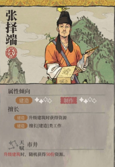张择端是一名天级居民,其核心定位在于利用建筑升级过程来额外获取资源,是一位在游戏前中期开荒与发展阶段颇具价值的角色。他主要通过限时卡池上河抽取获得,活动结束后会进入精英卡池。其天赋市井的效果是,在升级建筑时,能够随机获得50份资源,这使得他将精力集中于对建筑的升级操作上,而非简单的建造或生产。他的主要属性为建造,次优属性为农牧或制作,基础建造属性为794点,这决定了他最适合参与建筑升级工作。