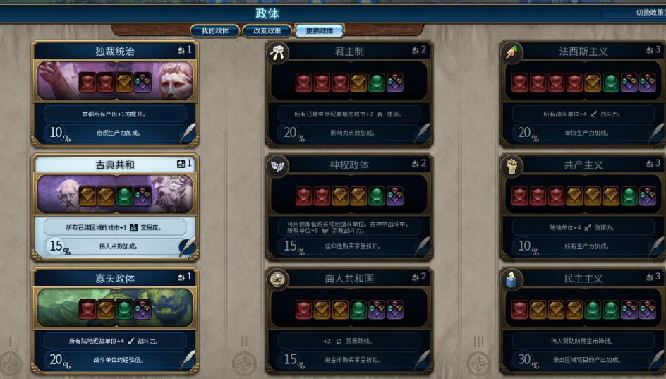 市政广场建筑的等级与政体时代严格对应。一级建筑对应古典时代的政体,三级建筑对应工业时代及以后的政体。这意味着你想获得某个时代政体的传承卡,就必须在建造对应等级的市政建筑时,处于那个时代的特定政体之下。要获得商业共和政体的传承卡,你需要在建造市政广场的二级建筑(对应文艺复兴时代)时,正处于商业共和政体之下。每个等级的市政建筑你只能建造一个,因此每个时代你只有一次机会来获取该时代某个政体的传承卡,选择需要谨慎。