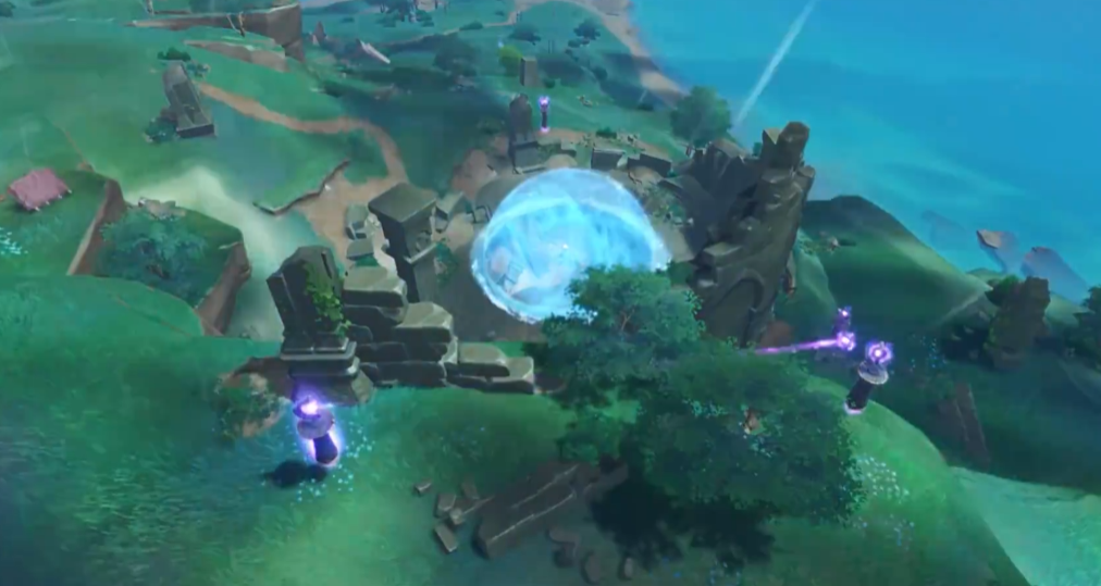 首先需要找到位于祭坛中央的大水泡,周围环绕着四根可旋转的柱子。每根柱子分为转向和仰角两个调整维度,转向决定射线水平方向,仰角控制射线高低。关键操作顺序为:光柱1转向对准2号柱(仰角中),光柱2转向对准3号柱(仰角下),光柱3转向对准4号柱(
