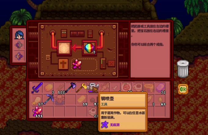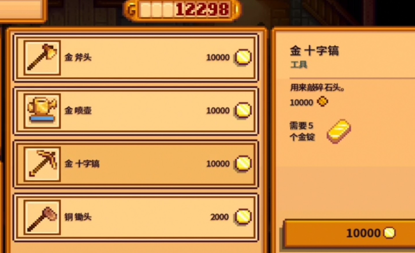 锄头和水壶升级后会扩大作用范围,比如铜水壶能浇灌面前直线3格,而铱水壶能覆盖3×6的大面积区域。斧头和镐子则能提高采集效率,比如铁斧可以砍伐硬木,金镐能砸开陨石。钓鱼竿升级后可以安装鱼饵和浮标,提升钓鱼成功率。合理规划升级顺序能让农场事半功倍。平时多下矿洞收集矿石,或者用晶球兑换金属锭。如果缺钱,可以种高价值作物或酿酒出售。工具升级是长期投资,虽然前期花费较高,但后期能节省大量时间和体力。