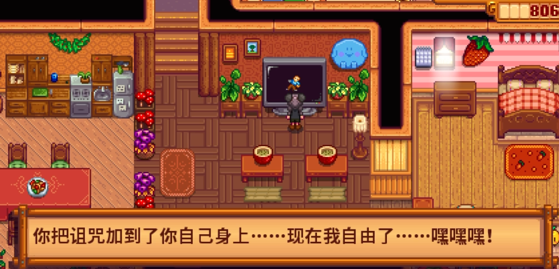 在标准农场地图中,秋季26号观看电视选择???选项时,会出现怪异信息并生成古代玩偶。这个被诅咒的玩具会在私欲之黑暗神殿前攻击玩家,被击败后会变成大黑鸟飞走。每次重新进入女巫小屋,该玩偶都会重生,值得注意的是击败玩偶会计入消灭怪物的任务进度。