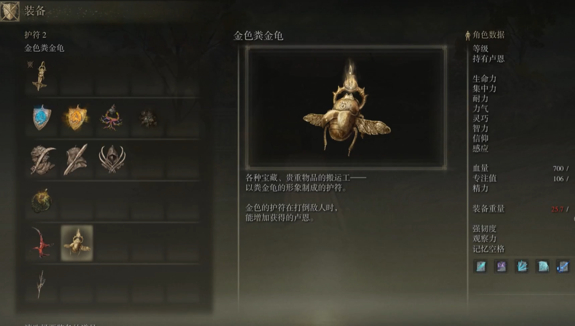 护符是刷卢恩的必备品,金色粪金龟能显著增加击败敌人后获得的卢恩数量。获取它需要前往熏烧火墙赐福点,沿着东北方向的黄金树前进,进入废弃洞穴。击败洞内的双BOSS后就能拿到这个神器。腌制黄金鸟爪也能临时提升卢恩获取量,虽然无法无限购买,但可以通过收集罗亚果实、四趾鸟爪和金色萤火虫自行制作。有了这两样道具,你的刷卢恩效率会大幅提升。