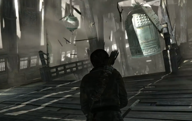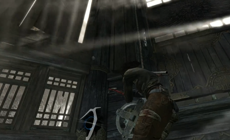 场景中存在两处易忽略的细节:一是窗户开关机关位于墙侧,需近距离交互;二是钟摆绳索的射击点为大钟底部金属环,需精确瞄准。操作期间需注意躲避掉落的木屑碎片,角色若被击中会中断当前动作。完成撞击后,地面塌陷形成的通道需快速通过,延迟可能导致坍塌阻断路线。