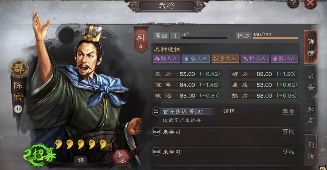陈宫是一位以谋略输出和辅助功能见长的武将,其自带战法百计多谋属于指挥类型,每回合有较高概率对随机敌军单体造成真实伤害,该伤害无视防御且完全受智力属性影响,使陈宫在面对高统率或控制型队伍时也能保持稳定输出。兵书系统能进一步强化他的战场表现,玩